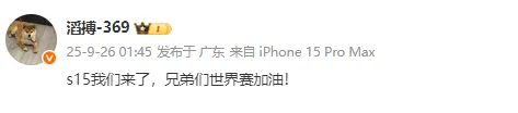 "s15我们来了,兄弟们世界赛加油! "