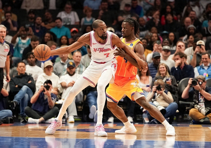 过去一段时间,由于范弗利特赛季报销,杜兰特被迫承担更多组织责任。他常常在持球突破时选择分球给队友,结果反而增加了失误风险。因为杜兰特出球时机被对手预判,传球路线被切断,导致球队进攻陷入停滞。但今天不同,杜兰特变得不管不顾。一旦接到球,他就果断发起进攻,要么直接干拔跳投,要么强行突破内线。只有在对手多人包夹、完全没有出手空间时,他才会选择传球。这种打法其实才更符合杜兰特的本质天赋。